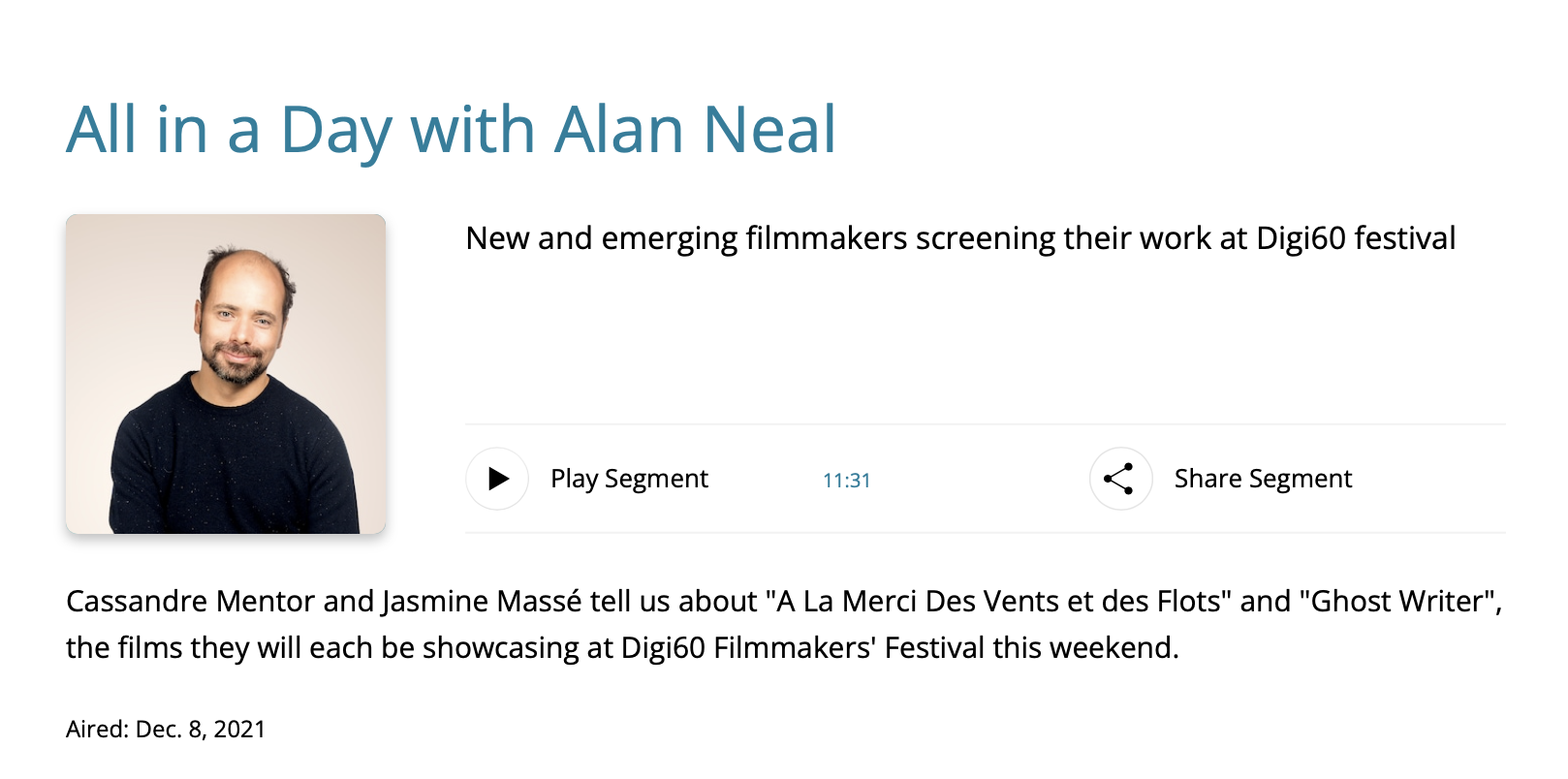 But the coolest opportunity I got was a live radio chat on CBC’s All in a Day with Alan Neal! They requested to talk to me about my film! I couldn’t believe it. I was so nervous, especially since it was a bit difficult to hear the questions through the phone. But I hope I did well and it was definitely one of the highlights of my year. You can have a listen to my interview by clicking the image below: